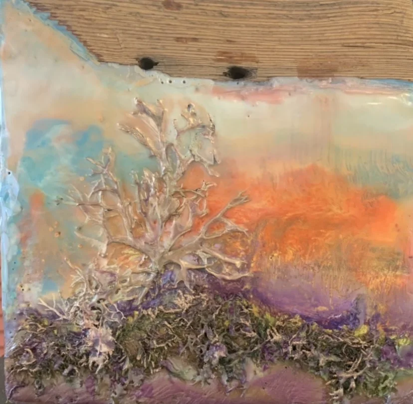 Her most recent work embraces an ancient medium called “encaustic”…which is the art of painting with hot beeswax, oil pigments and Damar resin. In addition to painting on birch board, Katherine applies her new medium to live edge wood pieces. Exciting things happen when she opens her mind and intuition to the endless possibilities that encaustic painting can reveal.