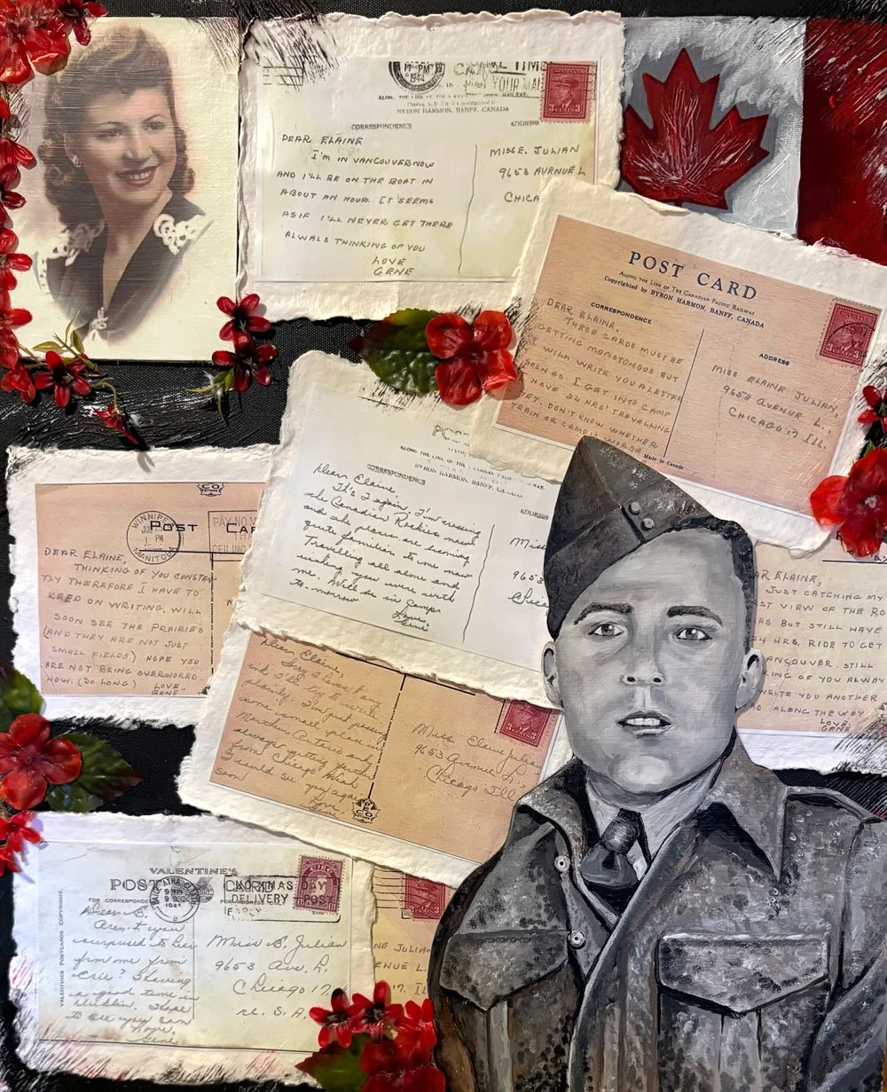 Medium: Mixed media: acrylic painting, collage, and photographyThis work honours my late in-laws, Elaine and Gino Pannunzio. Their families came from neighbouring villages in Italy, and during the Second World War, their love endured across oceans through letters and postcards. Gino served in the Canadian Army while Elaine waited in Chicago. After four years of service, they were married in 1946 — their story, one among countless others, stands as a beacon of love and remembrance.