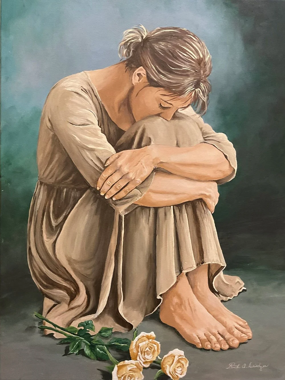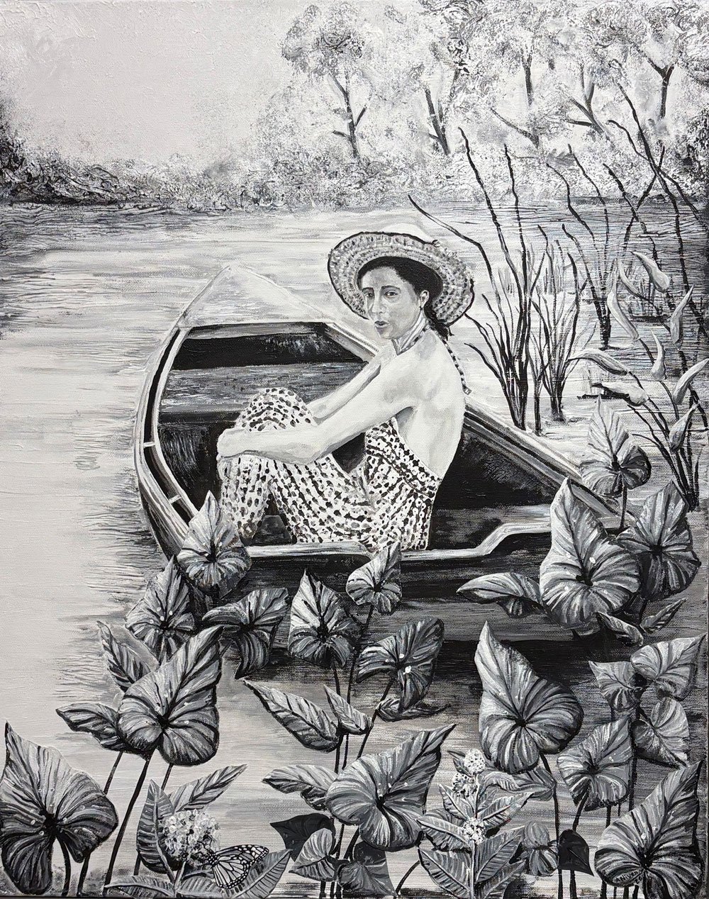 Size: 24 × 30 inchesInspired by an old photograph of the artist’s grandmother, Golden Hours captures a moment held in stillness. The figure floats gently in a wooden boat, surrounded by water lilies and nature’s quiet presence. A Monarch butterfly emerges as a subtle symbol of memory and transformation, evoking the fragile beauty of fleeting moments — those rare hours when everything feels perfect, even if only for a while.