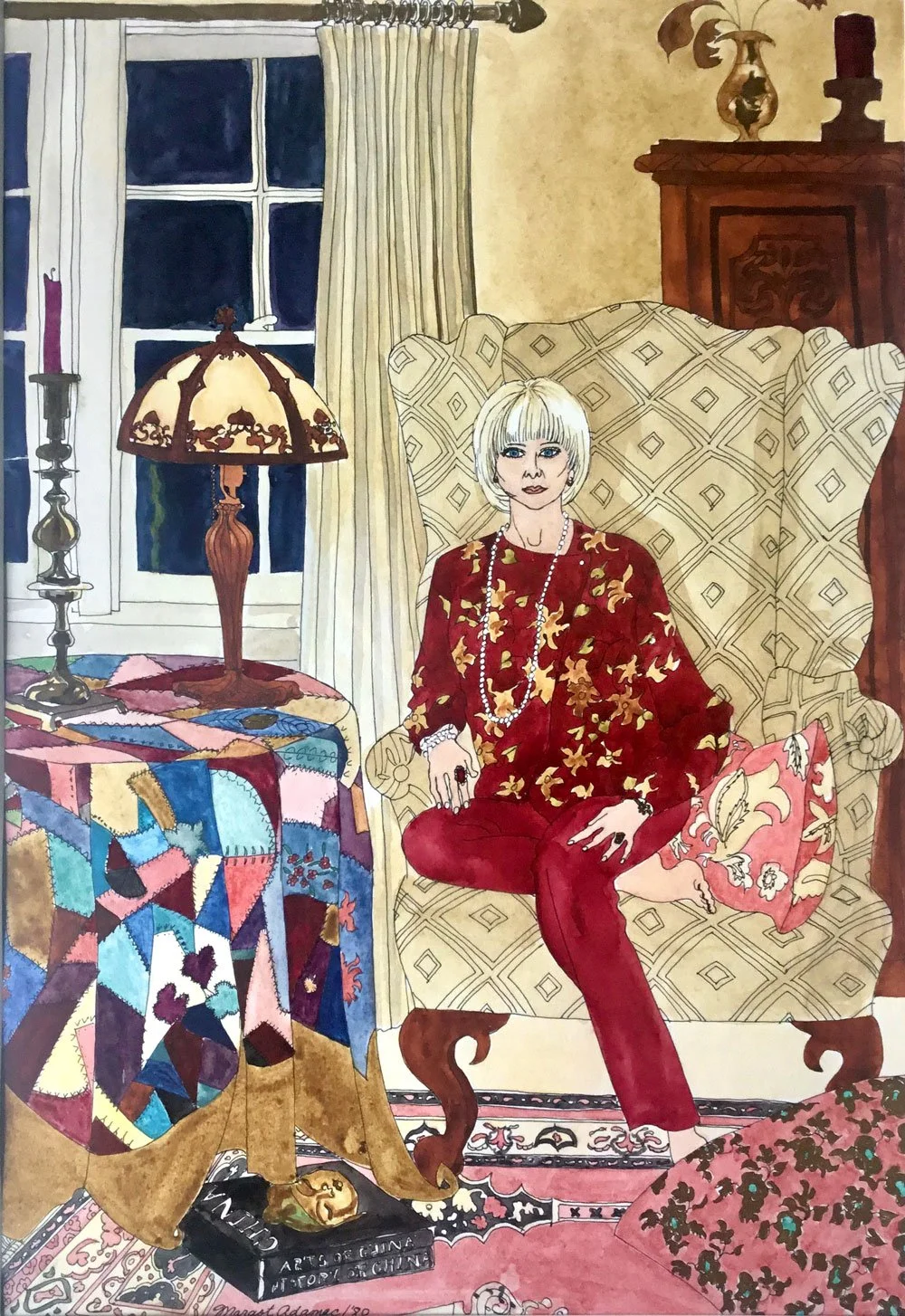 Medium: Watercolour and ink on illustration boardA portrait I did of her in 1980 in her Calvin Klein silk outfit, surrounded by the antiques she collected so she could have pretty things at half the price. I owe everything to her — my heritage, my memories, my past.