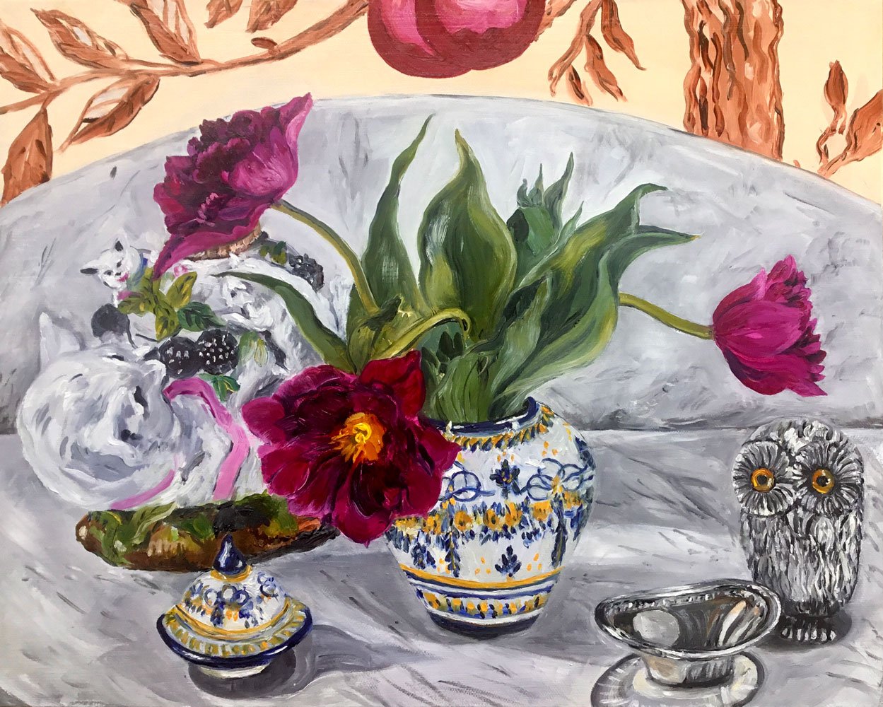 Treasures left to us from my mother-in-law sit on a Dutch marble antique washstand that was my mother’s — an Italian jar, a porcelain mother cat and kittens oil lamp, and a silver owl. These things I delighted in the challenge of painting. In the background is my own mural, copied from a magazine of a 17th-century Persian wallpaper.